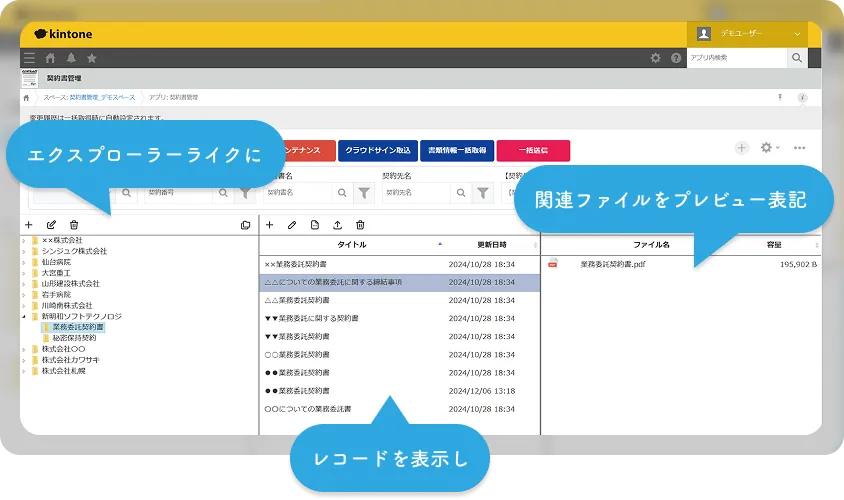kintoneで契約書を電子管理すれば、このような悩みが解消されるだけでなく、業務で必要なアプリをノンプログラミングで作成し、それらを連携することで、業務の効率化を進めることができます。