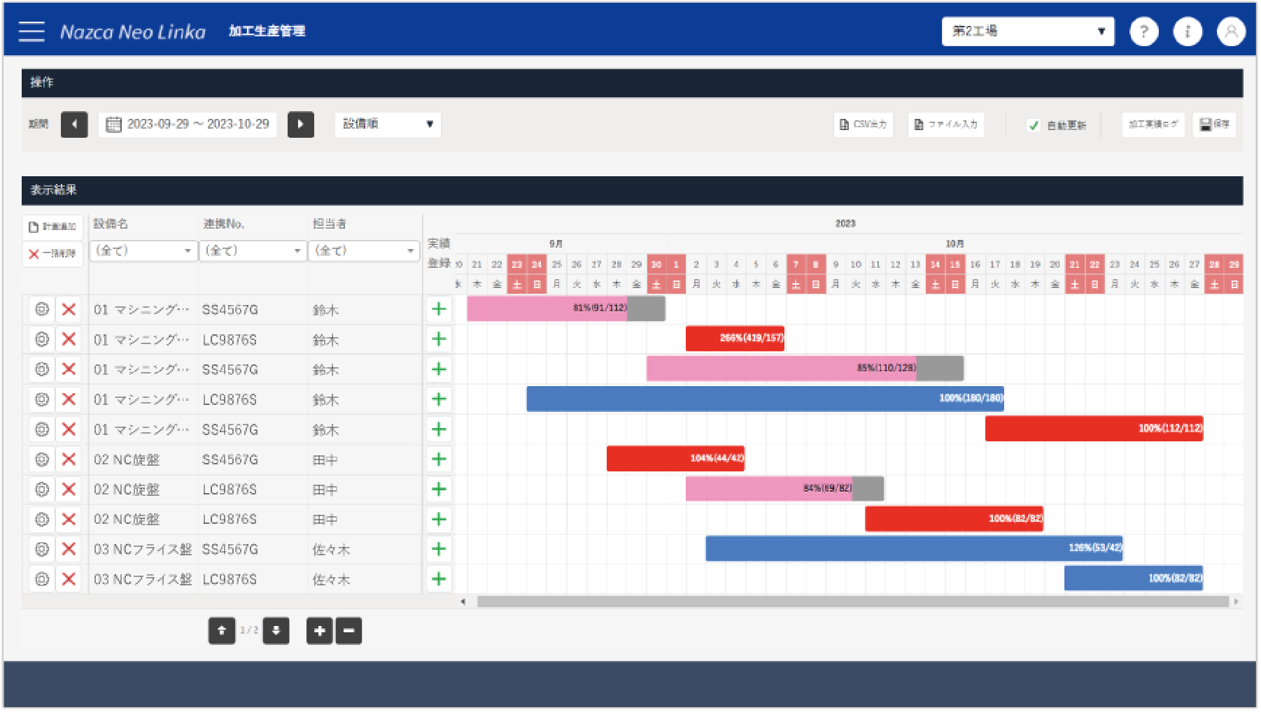 加工計画に対する実績(生産個数)の達成状況をリアルタイムに確認でき、現場での進捗把握に役立ちます。